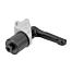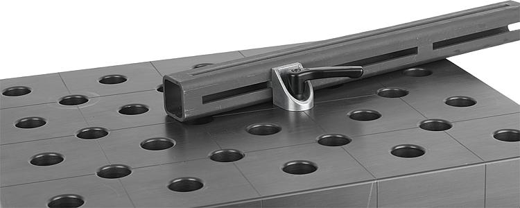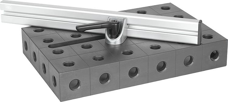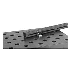 提示:夹紧角件适用于将铝材固定在孔径为 16 mm、20 mm 或 28 mm 的孔型栅格板或托板中,例如可用作止挡点。通过放开锁紧手柄解锁两个夹具,从而实现自由转动和移动。夹紧销和夹紧角件通常成对使用。优点:当夹紧板材料厚度很薄时也可确保功能正常(金属 ≥8 mm 或 ≥4 mm,木料 ≥18 mm)。