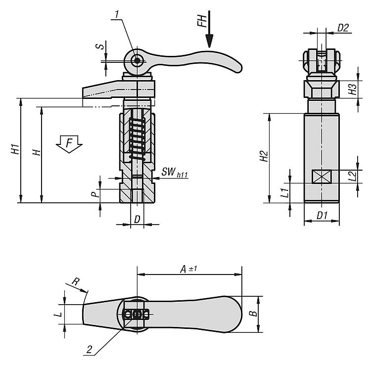 通过双头螺栓的细螺纹可以借助螺栓刀调节精确的夹紧高度。调整后通过锁紧螺栓锁紧。尺寸 S 相当于偏心轮的夹紧行程。