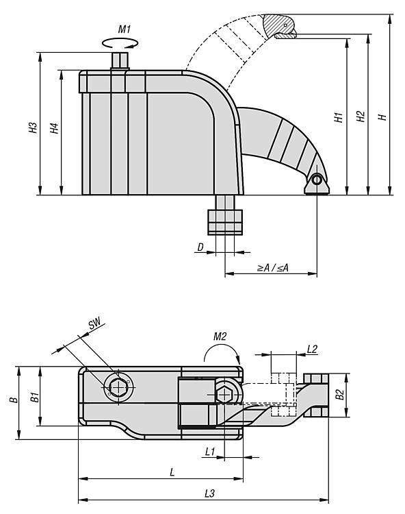 | H | H1 | H2 | H3 | H4 | L | L1 | L2 | L3 | 槽宽 | SW | 夹紧力 kN | 锁紧扭矩 M1 Nm | 锁紧扭矩 M2 Nm | CAD | 配件 | 价格 | 订购 |