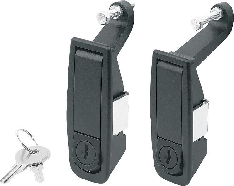 锁闭为同时锁定,即每把锁可用同一把钥匙打开。使用说明:按下按钮后,锁闩移动到打开位置,即可打开门。 闭合杠杆时,门会被压在门框上。应用:- 机械工程 - 开关柜 - 车辆制造 - 实验室设备 - 包装工业装配:1. 根据草图制作装配切口。 2. 从正面将锁闩插入安装口。 3. 从后面拧紧螺栓,这样就能将安装支架拉到门板上,并将锁闩固定在安装口。 供货范围供货范围包括螺栓、螺母和安装支架。 每个可上锁的压缩杠杆式锁闩都配有 2 把钥匙。图纸提示:特点: 下载此处为收集信息的 PDF: