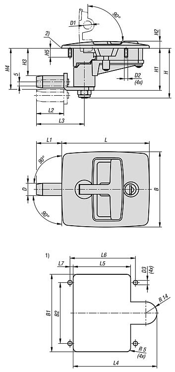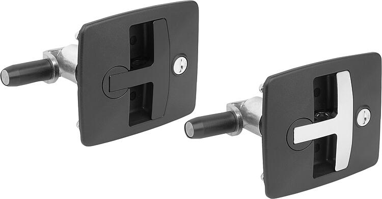 T 型把手和外壳上有一个 D1 孔,可以额外插入挂锁。使用说明:用钥匙打开锁闩。折出 T 型把手可以释放夹紧力,这样只要将把手旋转 90°(左转或右转)就可以打开门。 再次将 T 型把手旋转 90°,使门闩到锁定位置。通过折入 T 型把手产生夹紧力,门闩压在门框上。 锁闩可以用钥匙或额外的挂锁固定。应用:- 机械工程 - 开关柜 - 车辆制造 - 实验室设备 - 包装工业装配:1. 根据草图制作装配切口。 2. 从正面将锁闩插入安装口。 3. 使用螺母从后面紧固。供货范围供货范围包括注塑固定螺栓的螺母和 2 把钥匙。图纸提示:特点: 下载此处为收集信息的 PDF: