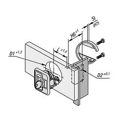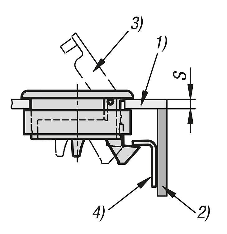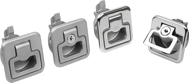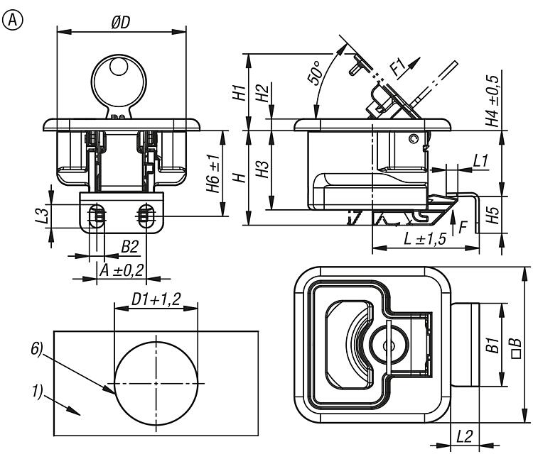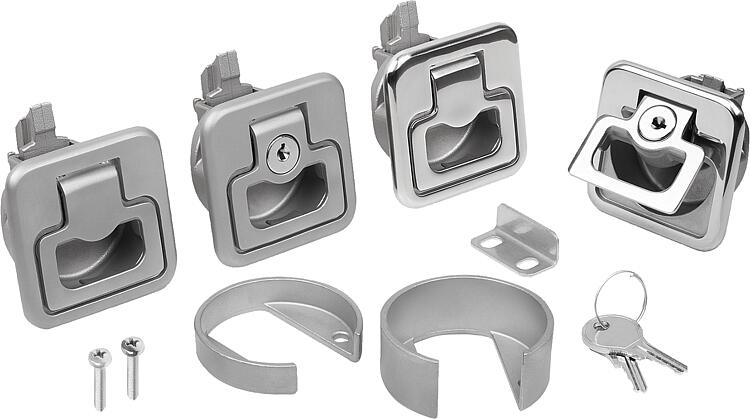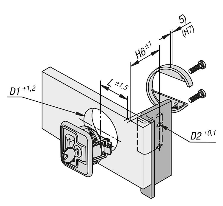 A 型:可锁定 B 型:不可锁定使用说明:拉动把手,将锁闩置于打开位置,即可打开门。关紧门后会自动确保锁定。也可从后面操作锁闩。应用:- 汽车行业 - 机械工业 - 造船 - 航天 - 移动房屋和房车 - 医疗技术装配:1. 根据图纸制造安装切口。 2. 连接安装支架。 3. 使用安装部件从后侧固定。供货范围安装托架,以及合适的螺栓 (M4) 和安装支架在供货范围内。 这种可锁定的弹簧锁配有 2 把钥匙。 安装支架的螺栓 (M5) 未包含在供货范围内。 图纸提示:1) 门板 2) 框架 3) 把手 4) 安装支架 5) 安装托架高度(请参见表 H7) 6) 安装切口 特点: 下载此处为收集信息的 PDF: