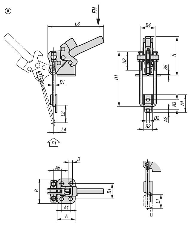 钢或不锈钢压紧式环箍夹钳,立式,带固定夹具和安全锁,最大 9000N,A 型