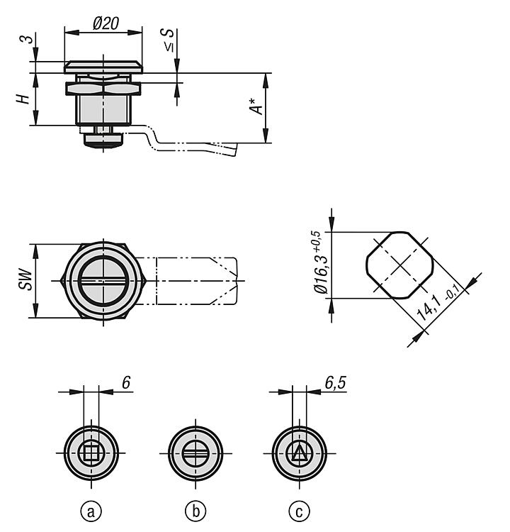 *尺寸 A 由旋转锁销和簧片组合而成,显示的是匹配的簧片。附件:套筒扳手 05586。 钢制紧凑型旋转锁销的舌簧 05563。图纸提示:
