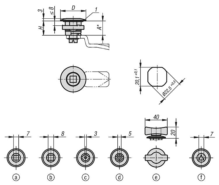 *尺寸 A 由旋转锁销和簧片组合而成,显示的是匹配的簧片。