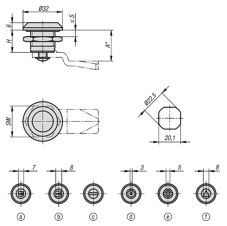 *尺寸 A 由旋转锁销和簧片组合而成,显示的是匹配的簧片。