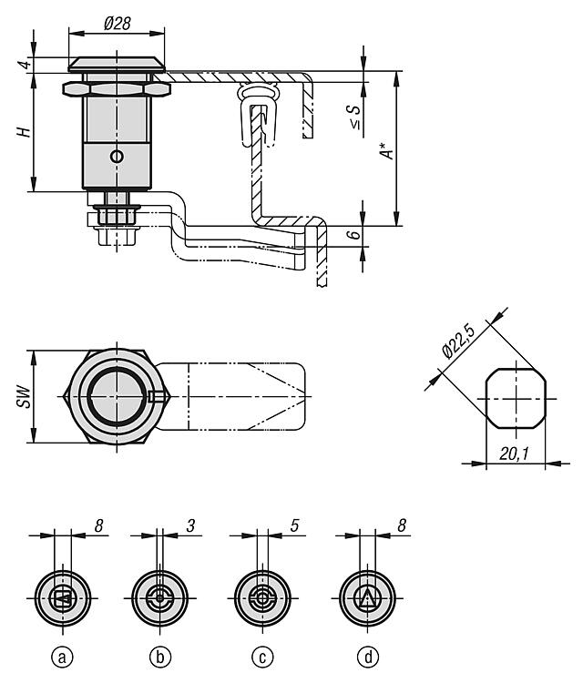 *尺寸 A 由旋转锁销和簧片组合而成,显示的是匹配的簧片。
