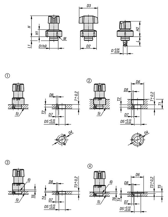 如果超过夹持力,则板与板之间会产生 0.1 mm 以上的间隙。使用说明:确保旋钮处于“OFF”档位。 将旋转锁销推到或放到预装配的夹紧板上。 将旋钮向下按并拧到档位“ON”上。 完全夹紧时会听到一声咔嗒。附件:用于旋转夹紧装置的钢制夹紧板 05592-30。 用于旋转夹紧装置的不锈钢间隔片 05592-15。图纸提示:1) 安装方式 1 2) 安装方式 2 3) 安装方式 3 4) 安装方式 4 5) 板 6) 间隔片 特点: 下载此处为收集信息的 PDF: