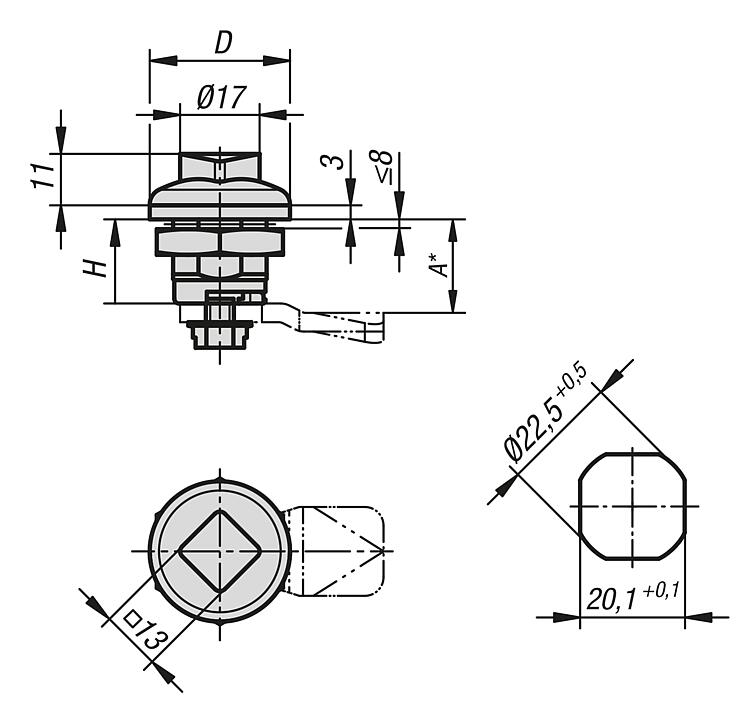 *尺寸 A 由旋转锁销和簧片组合而成,显示的是匹配的簧片。附件:旋转锁销的套筒扳手 05586-04.