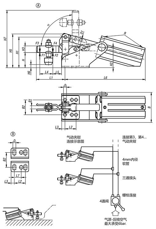 选择标准:为了便于合适型号夹钳的选取,表格中列出了气压6bar下 最大的夹紧力和夹持力。F3为压杆远端最大的夹紧力,F4为靠近支点处最大的夹紧力。控制:图中示例为一个或多个气动夹钳的简单控制管路图。如需设计完整的控制系统,可联系相应的气动阀厂家,他们能提供相应方案和相关配件。说明:表中F1和F2标注的为夹持力;F3和F4为夹紧力。特点: