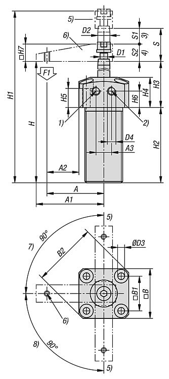 转角气缸的回转动作不能与其他部件干涉。F1 = 气压 6 bar 下提供的最大工作压力。