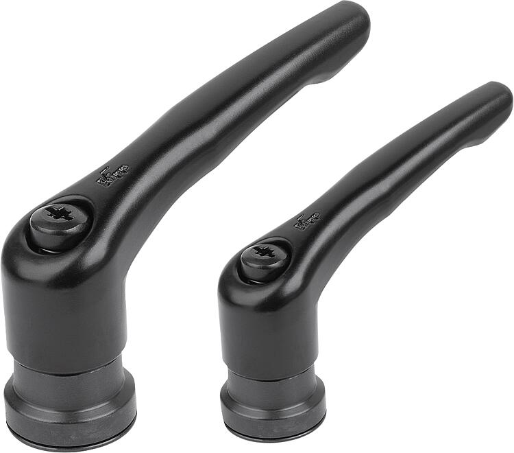 通过大的紧固支承面来保护夹紧的工件。因此不再需要垫片。材料:压铸锌材质的把手,符合 DIN EN 12844。 强度等级 5.8 的钢制部件。规格:把手经塑料涂层。 钢制部件经黑色氧化。 推力滚针轴承,带经硬化和磨光处理的限位垫片。使用说明:手柄杆在未受控制的状态下通过一个齿圈卡入螺纹嵌入件中。抬起把手可将其换入位置并通过弹簧弹力重新卡入齿圈。应用:机械、仪器和设备制造,康复区。优点:在使用同样的紧固力矩的情况下,显著增加了夹持力。 高质量轴向滚针轴承,额定载荷高,使用寿命长。 稳固的支撑面保护了组件。根据要求:其他颜色。特点: 下载此处为收集信息的 PDF: