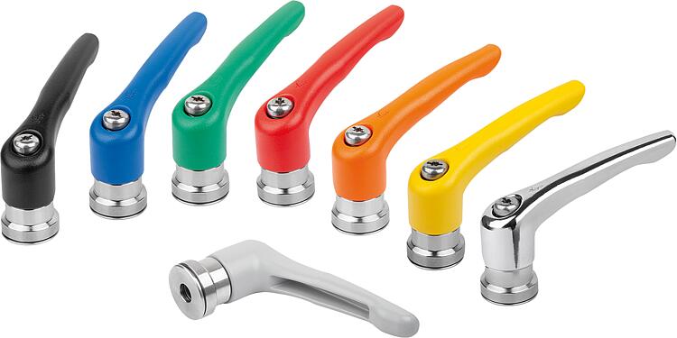使用说明:手柄杆在未受控制的状态下通过一个齿圈卡入螺纹嵌入件中。抬起把手可将其换入位置并通过弹簧弹力重新卡入齿圈。应用:机械、仪器和设备制造,康复区。装配:拧入深度必须至少为螺纹直径的 2 倍,安装时应轻微润滑螺纹。优点:在使用同样的紧固力矩的情况下,显著增加了夹持力。