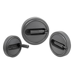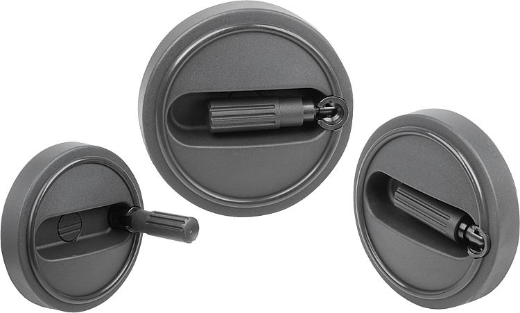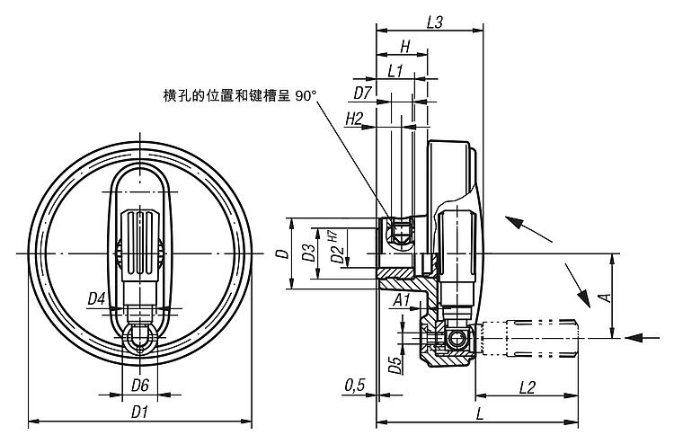 产品说明材料:手轮盘和把手,热塑性塑料,黑灰色。规格:钢制部件经黑色氧化。提示:随供的套筒盖板并未安装。手轮可通过十字销钉或者用一个圆柱头螺栓 DIN 6912 和一个垫圈 DIN 7349 轴向通过键槽连接固定在轴上面。 为了使安全型手柄处于操作位置,要执行两个调整操作: - 将把手和旋转轴旋转至挡块位置 (90°)。 - 沿轴向方向将把手压入锁定位置。 在被压入的位置处,可以通过握持把手最舒适轻松地转动曲柄。松开后会自动摆回。 如果是带横孔的规格,则要通过旋入的埋头螺栓 ISO 4026 (DIN 913) 进行固定。 安装示例请参见 06262。特点: 下载此处为收集信息的 PDF: