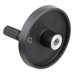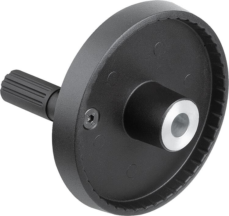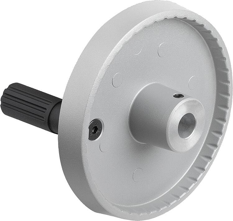 06278-01_E铝制圆盘手轮,带有可旋转的圆柱形手柄,E 型,带装配孔 |