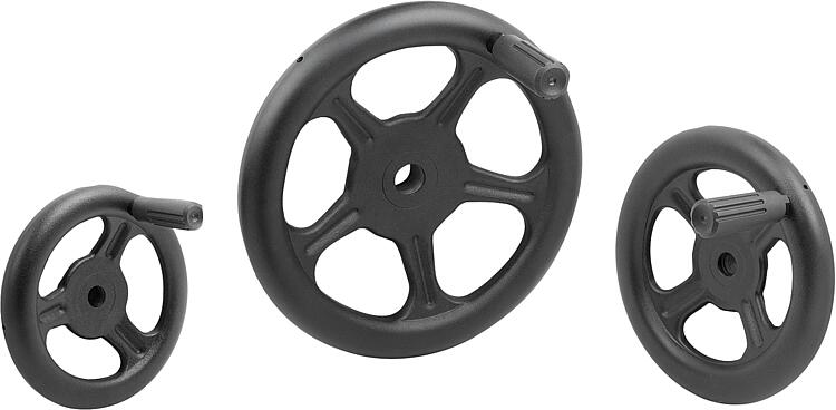产品说明产品描述:手轮用于对轴和主轴进行精确的手动定位和调整。坚固的设计具有抗震和抗冲击性能。热塑性塑料制成的可自由旋转曲柄手感舒适,即使在长时间或高强度的动作中也能舒适操作。材料:钢制手轮。 热塑曲柄。 气缸手柄轴 钢强度等级 5.8。 带内六角的沉头螺钉 钢质强度等级 8.8。规格:手轮喷涂黑色粉末 RAL 9005。 RAL 7021 黑灰色曲柄。 滚筒手柄轴抛光。 黑色内六角沉头螺钉。提示:形式 A:3 根辐条(直径 125 毫米)。 形式 B:4 根辐条(直径 160 毫米、200 毫米)。 形式 C:5 根辐条(直径分别为 250 毫米、315 毫米、400 毫米)。