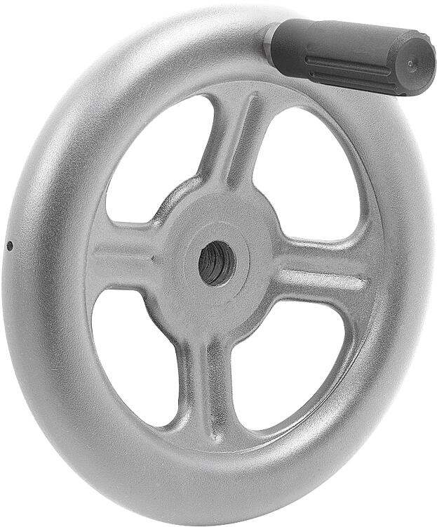 产品说明产品描述:手轮用于对轴和主轴进行精确的手动定位和调整。坚固的设计具有抗震和抗冲击性能。热塑性塑料制成的可自由旋转曲柄手感舒适,即使在长时间或高强度的动作中也能舒适操作。材料:规格:手轮亚光喷砂。 RAL 7021 黑灰色曲柄。 气缸手柄轴毛坯。 空心六角沉头螺钉。提示:形式 A:3 根辐条(直径 125 毫米)。 形式 B:4 根辐条(直径 160 毫米、200 毫米)。 形式 C:5 根辐条(直径分别为 250 毫米、315 毫米、400 毫米)。
