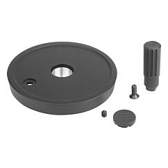 产品说明材料:铝制手轮。 圆柱形手柄和黑色热塑性轮毂盖。 钢制圆柱形手柄轴经氧化处理。 埋头螺栓 ISO 4027,钢制,强度等级 45 H,黑色。规格:黑色或银色的粉末涂层。