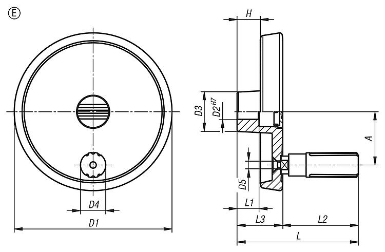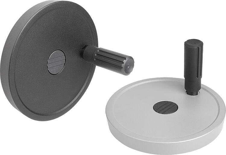 铝制圆盘手轮,带有可旋转的圆柱形手柄,E 型,带装配孔 |
