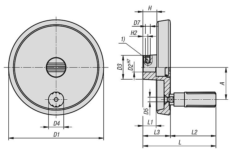 带装配孔。 带装配孔和键槽。 带装配孔和十字孔。 带装配孔、键槽和十字孔。提示:轮辋的径跳和端跳 ≤ 0.4 mm。装配:轮毂盖和可旋转的圆柱形手柄并未安装。安装时,必须将手柄轴拧入安装孔中。 手轮可通过十字销钉或者通过一个圆柱头螺栓 DIN 6912 和一个垫圈 07375 轴向通过键槽连接固定在轴上面。 如果是带横孔的规格,则要通过旋入的埋头螺栓 ISO 4027 进行固定。附件:07375 沉孔垫圈。 07161 短头内六角螺栓 DIN 6912。供货范围铝制手轮。 轮毂盖。 可旋转的圆柱形手柄。 埋头螺栓 ISO 4027(带横孔的规格)。图纸提示:特点: 下载此处为收集信息的 PDF: