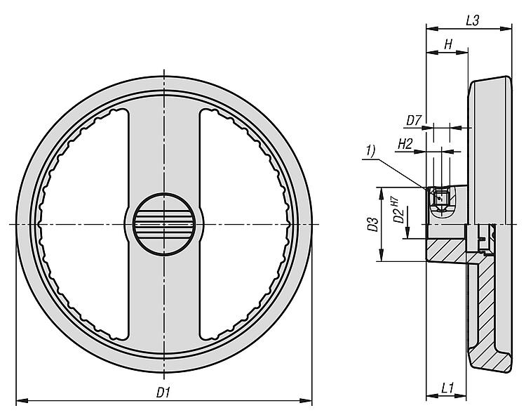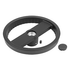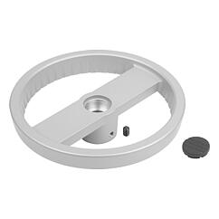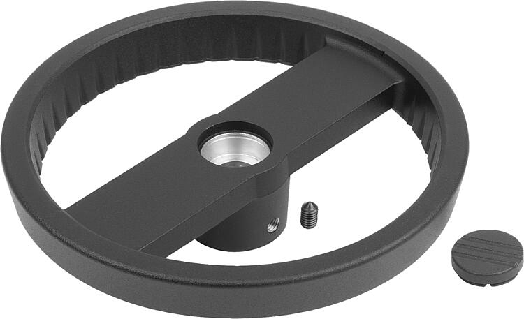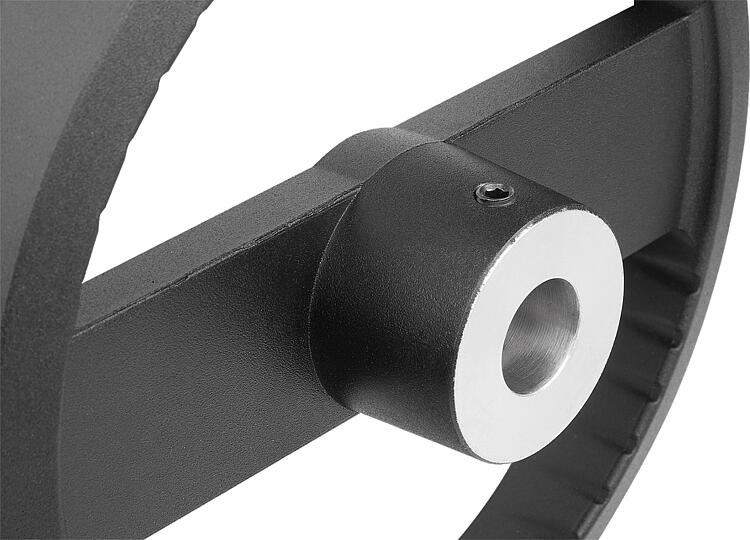 带装配孔。 带装配孔和键槽。 带装配孔和十字孔。 带装配孔、键槽和十字孔。提示:轮辋的径跳和端跳 ≤ 0.4 mm。装配:轮毂盖并未安装。 手轮可通过十字销钉或者通过一个圆柱头螺栓 DIN 6912 和一个垫圈 07375 轴向通过键槽连接固定在轴上面。 如果是带横孔的规格,则要通过旋入的埋头螺栓 ISO 4027 进行固定。附件:07375 沉孔垫圈。 07161 短头内六角螺栓 DIN 6912。供货范围铝制手轮。 轮毂盖。 埋头螺栓 ISO 4027(带横孔的规格)。图纸提示:特点: 下载此处为收集信息的 PDF: