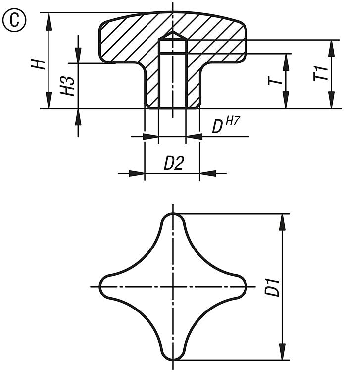 十字把手,类似 DIN 6335,不锈钢,C 型,盲孔