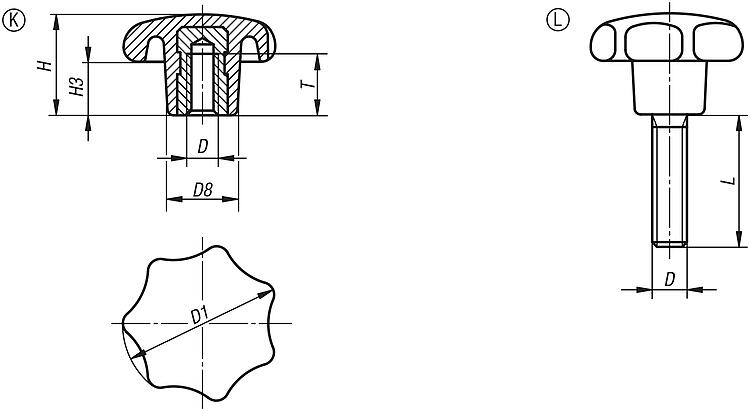 星形旋钮,类似 DIN 6336,不锈钢,L 型,带外螺纹