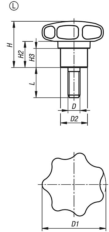 塑料星形旋钮,带凸出型钢制衬套,L 型,外螺纹