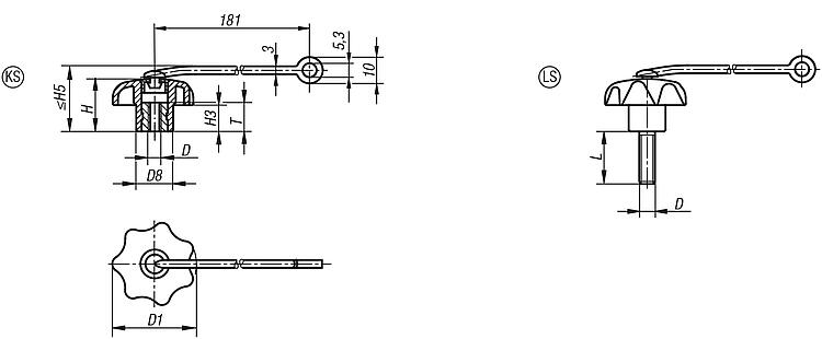 带挂绳的星型旋钮 类似 DIN 6336,外螺纹,LS 型