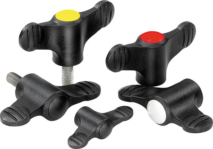 带顶盖的塑料蝶形旋钮,钢制或不锈钢螺纹嵌入件,带外螺纹