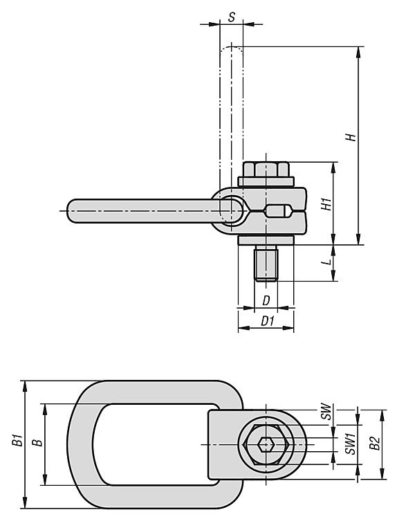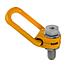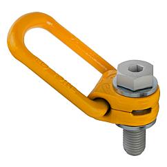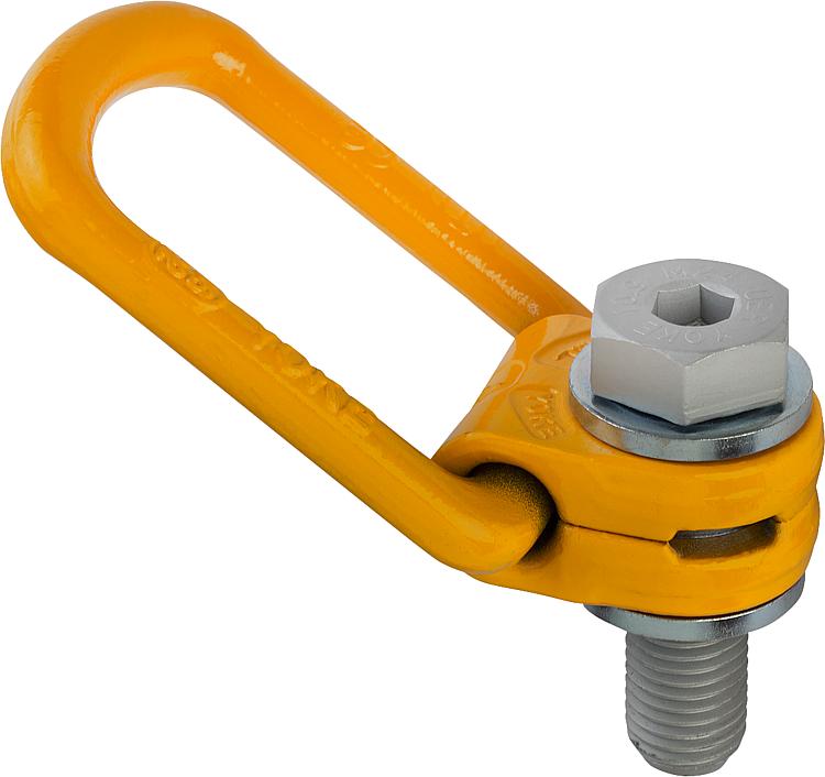 提示:吊环可折叠,360° 可旋转,且可以在任意牵引方向承受完整负载。嵌装弹簧可以在任何位置固定吊环螺栓。在吊环上明确注明额定负载能力。其适用于最不便于承载的情况(参见表格)。测试力为允许负载能力的 2.5 倍。配有防脱开,但可以拆除的六角螺丝。吊环符合机械要求,通过 BG 测试。温度范围:-40 °C 至 100 °C = 100 % 负载能力
