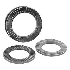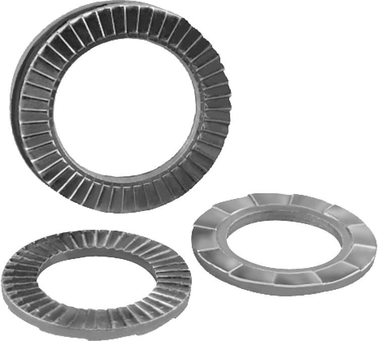 提示:楔形止动垫片可防止有横向载荷、受到振动和震动的螺栓连接松动。在低螺栓预应力下也可以确保连接。如果螺栓(螺母)由于晃动等影响有松动的迹象,垫圈会与其一同转动,自锁垫圈上的牙面会与配套的牙面咬合。即螺栓连接越“尝试”松动,垫圈的楔形效应就越能抵挡这种尝试。