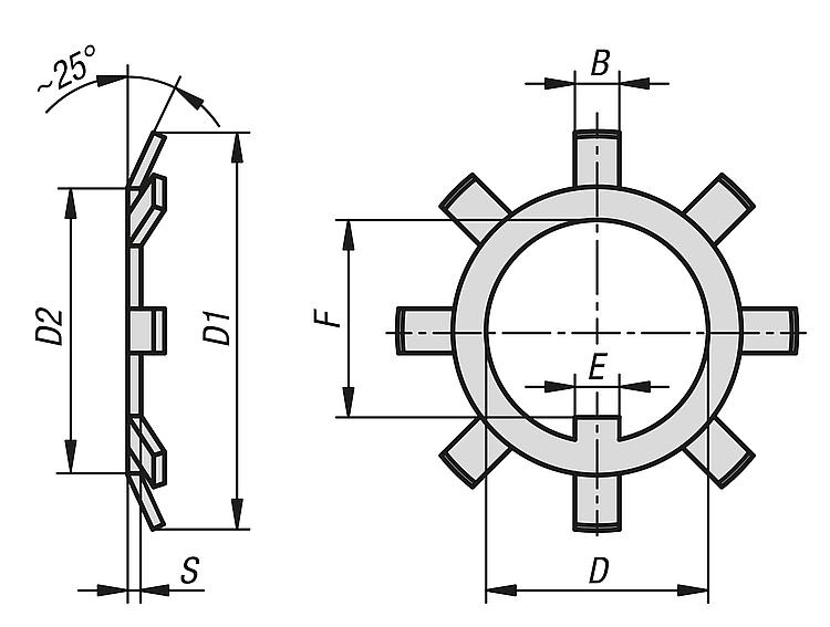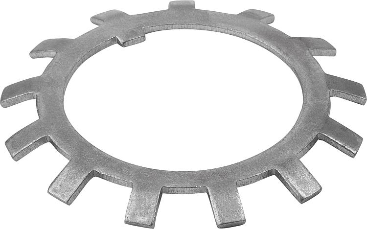 提示:DIN 5406 限动片用于固定 DIN 981 的帽型螺母。要使用限动片,螺栓螺纹上需要有一个键槽。特点: