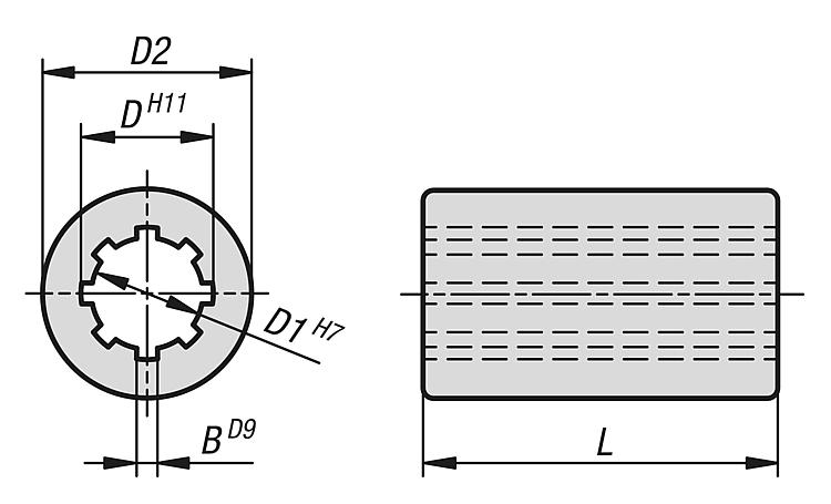 规格:亮色。提示:花键毂符合 DIN ISO 14 标准,带有直的平行侧面。花键轴及花键毂用于传递高扭矩,同时保持轴向位移。