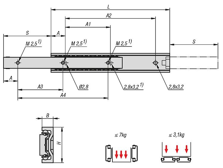 21332-15铝制伸缩滑轨,用于侧方安装,两侧部分伸出,负载能力最大 7 kg |