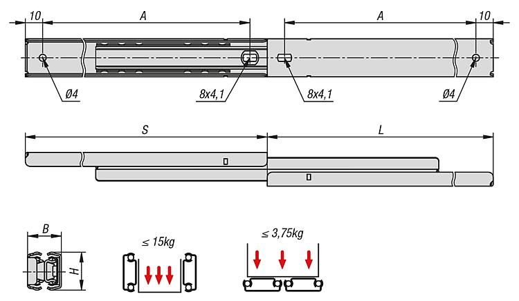 亮色滚珠。订购须知:成对出售。提示:伸缩滑轨全部伸出时,行程近似于安装长度,确保操作更加舒适、灵活。伸缩滑轨的动态承重能力在充分利用拉伸距离时,为垂直安装的伸缩滑轨对提供最大承重能力。指定的负载能力以 450 mm 轨道距离确定,为 10,000 周期时的最大值。