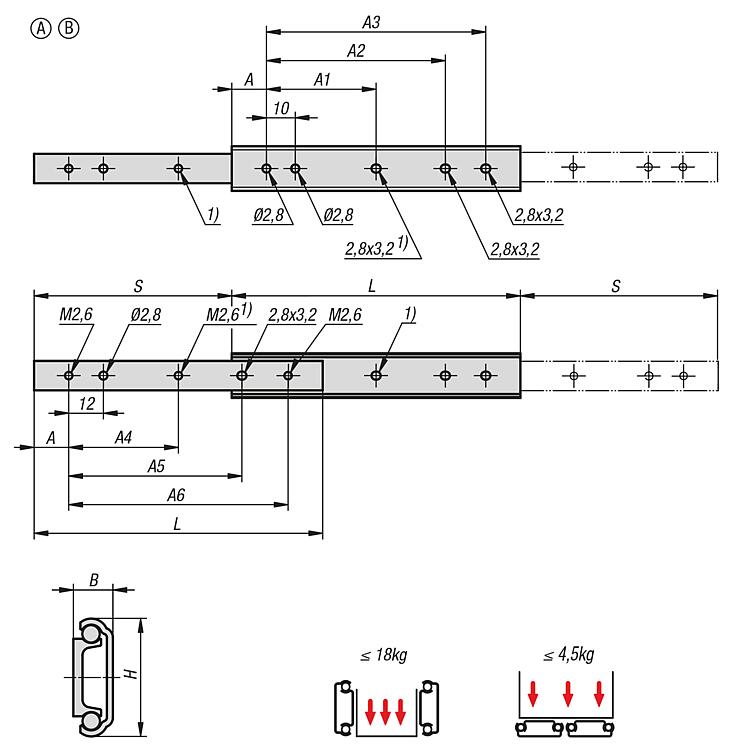 21333-95不锈钢制伸缩滑轨,用于侧方安装,两侧部分伸出,负载能力最大 18 kg |