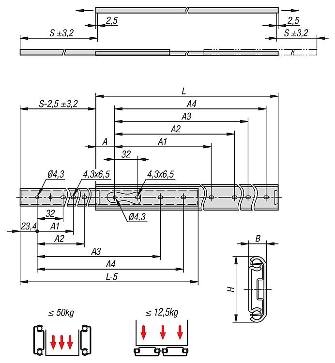 钢制伸缩滑轨 用于侧方安装,两侧部分伸出,负载能力最大 50 kg