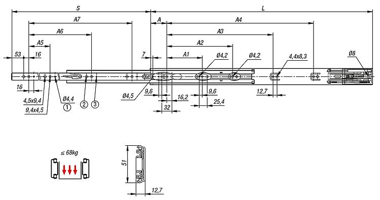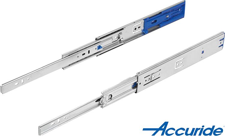 Datasheet 21334-54 钢制伸缩滑轨,用于侧方安装,全部伸出,负载能力最大 68 kg