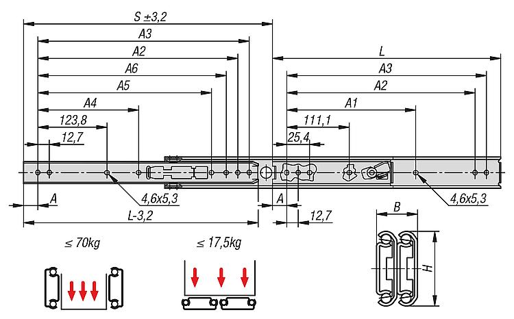 钢制伸缩滑轨 用于侧方安装,过度伸出,负载能力最大 70 kg