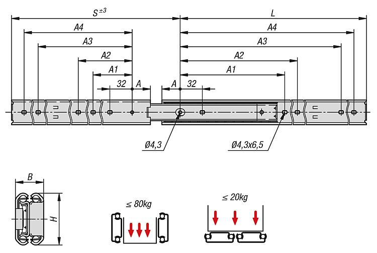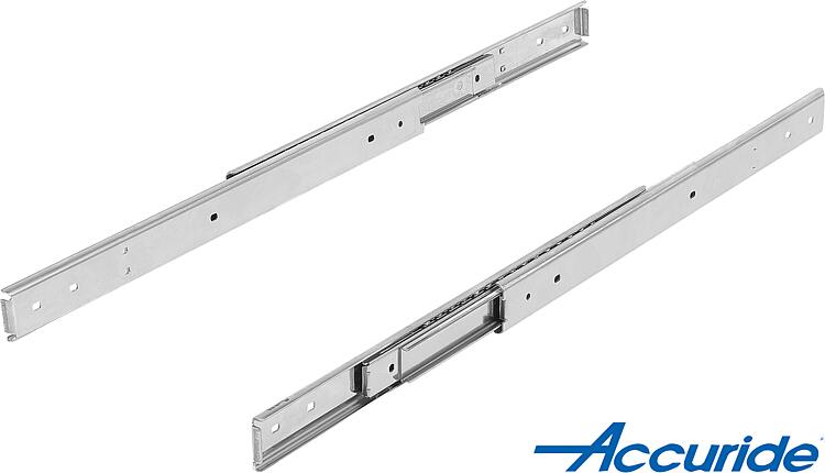 亮色滚珠。订购须知:成对出售。提示:伸缩滑轨全部伸出时,行程近似于安装长度,确保操作更加舒适、灵活。伸缩滑轨的动态承重能力在充分利用拉伸距离时,为垂直安装的伸缩滑轨对提供最大承重能力。指定的负载能力以 450 mm 轨道距离确定,为 10,000 周期时的最大值。