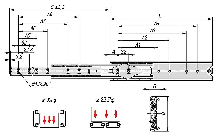 订购须知:成对出售。提示:过度伸出的伸缩滑轨中,冲程大于安装长度。闩锁位于关闭位置。伸缩滑轨的动态承载能力在充分利用拉伸距离时,为垂直安装的伸缩滑轨对提供最大负载能力。指定的负载能力以 450 mm 轨道距离来确定的,为 10,000 或 80,000 周期时的最大值。