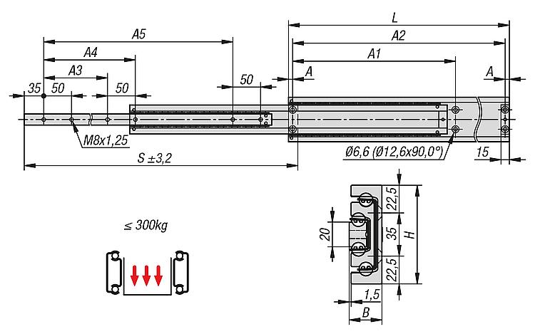 铝制伸缩滑轨 用于侧方安装,全部伸出,负载能力最大 300 kg