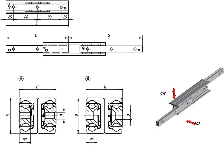订购须知:单个出售。提示:完全伸展滑道由两个导轨组成,他们组合构成双 T 型滑轨,中间通过转子连接用于支撑及滑动。紧凑型、方形结构及高承载量带来高负载能力和低挠度。最大行程大于伸缩式导轨的闭合长度。安装位置应优选水平。为了到达所有固定孔,需要移除用于安装的导轨中的止动螺栓,随后再次放入。通过移除止动螺栓达到两侧的行程。