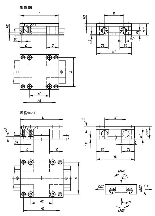 | 订货号 | 尺寸 | A | A1 | A2 | B | B1 | C | C1 | D | D1 | H | H1 | H2 | H3 | L | C0Y kN | C0(-Y) kN | C0Z kN | M0X Nm | M0Y Nm | M0Z Nm | CAD | 配件 | 价格 | 订购 |