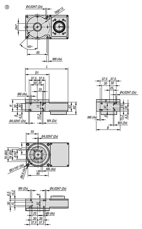 订货号 | 类型 | 形状类型 | 变速比 | L | B | H | H1 | H2 | D