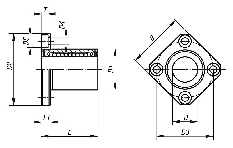 提示:线性滚珠轴承对应符合 ISO 10285-3。带两侧密封件。线性滚珠轴承配有一个塑料保持架。这确保了安静运行和突出的运行特性。带用于直接安装在壳体上的法兰。