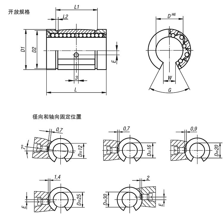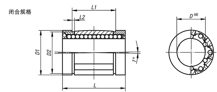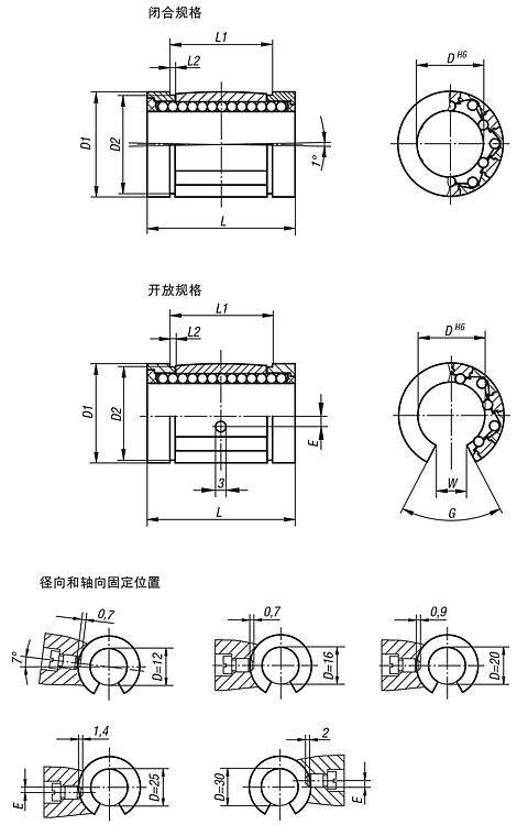 提示:线性滚珠轴承对应带自动角度误差补偿的符合 ISO 10285-3。带两侧密封件。此轴承由一个高精度注塑成型的塑料载体组成,其中固定有被夹紧的滚动轴承钢制滚道板。塑料载体同时用作返回装置和密封件接收装置。密封件由具有低摩擦系数的特殊聚酰胺材料制成。利用符合 DIN 471/472 的固定环固定线性滚珠轴承。