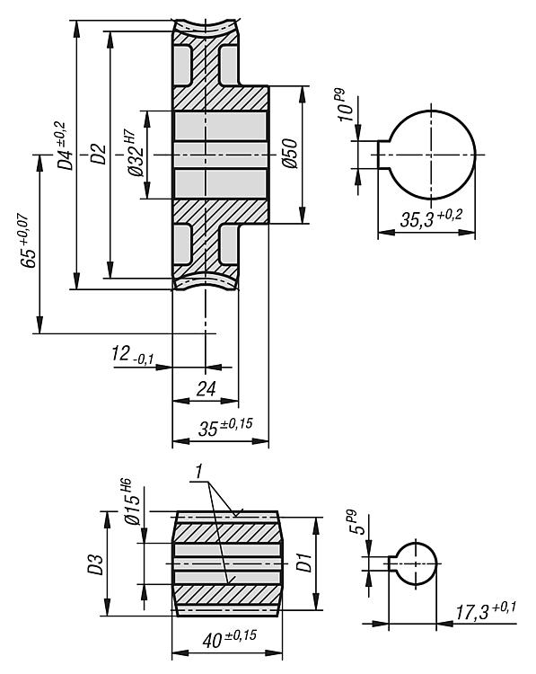 齿形的侧面形状为 K。啮合角为 15°。蜗轮组件已预先钻孔。