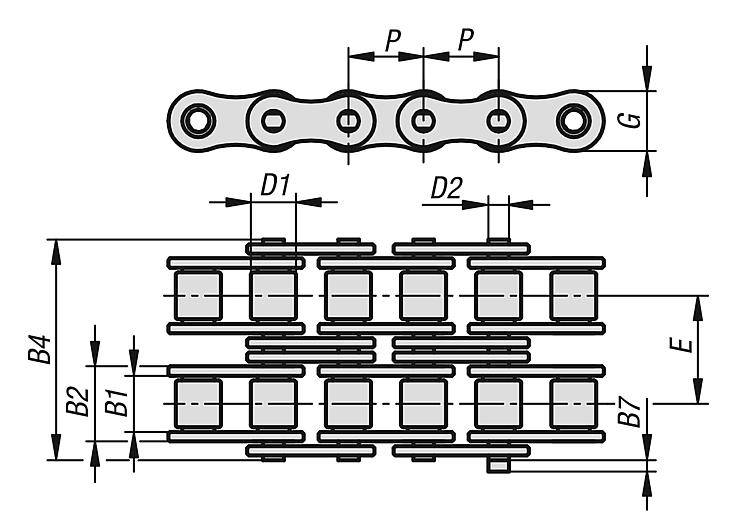 | 订货号 | ISO 编号 | 节距 英寸 | 节距 mm | B2 | B4 | B7 | D1 | D2 | E | G | ~L | 件数 | 断裂力 F 最小 kN | CAD | 配件 | 价格 | 订购 |